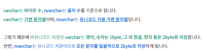 디비 이야기 5. 데이터 타입 1. 데이터 타입이란?= 다양한 데이터를 식별해주며 자료 마다 필요한 바이트 길이 등을 지정해준다 2. 데이터 타입 종류 (3가지)=> 거의 STIRNG / VARCHAR2 / NUMBER / DECIMAL 를 자주사용함 [ 문자형 데이터 타입 ]1) char = 고정형 길이타입(최대 255)으로 지정된 길이보다 짧을시 공백으로 채워진다2) varchar = 가변형 길이 타입(최대 약6만)으로 지정된 길이보다 짧을시 나머지 공간은 채우지 않는다 1] 가변 문자열이지만 NVAR는 무조건 2바이트2] 예시 [ 숫자형 데이터 타입 ]1) int= 양수,음수 포함하여 4바이트 가능2) bigint= 정수형 데이터 타입(8바이트) / 무제한 수 표현 가능3) float(길이, 소수) - 부동 소수형= 고정 소.. DB 이야기/DB 도메인 설계 2020.03.01