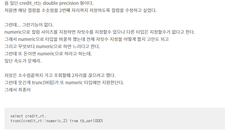 디비 이야기 8. 타입변환 1. 타입변환이란? = 명시적 형변환을 말한다. 2. 타입변환의 종류 1) 명시적 형변환 : 데이터 앞에 타입을 명시해주는 것으로 주로 큰 타입을 작은 타입으로 변환시 사용한다. 작은 것을 큰 타입으로 변환시 데이터 손실이 일어난다! 2) 묵시적 형변환 : 자동으로 타입을 변환해준다 3. DB의 타입변환 1] 문자를 숫자형태로 변환 - INT / FLOAT / NUMBERLIC/ DECIMAL -> NUMBERLIC(전체길이(소수점이하 포함), 소수점이하 길이) : 실수 -> DECIMAL(동일) : 실수 1) CONVERT 문법 : CONVERT(숫자형, 값)EX) CONVERT(INT, '10')-> 결과 : 10 2) TO_NUMBER 문법 : CONVERT와 동일 2] 숫자형 형태 높이기 1) C.. DB 이야기 2020.03.03