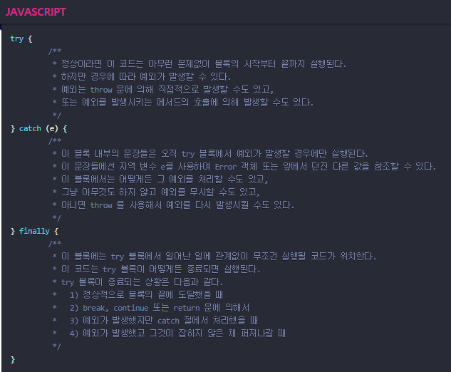 예외처리 1. 예외처리란? = 돌발상황 대처방안 / 고객 컴플레인과 같다. -> read나 외부에서 들어오는 것들에 대해서 컴플레인 있을시 처리한다. 2. 2가지 방법 1) Expection 상속 받아 처리 = 문제사항을 본사에 떠넘기기 2) try - catch - finally = 떠넘기기가 있으면 직접 처리하는 방법도 존재한다. - 자바 예외처리 일반적 참고 : https://webclub.tistory.com/71 자바 정리함 2020.09.27